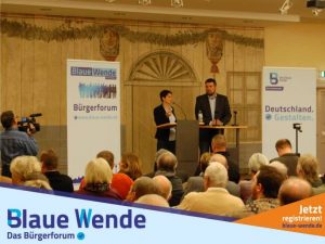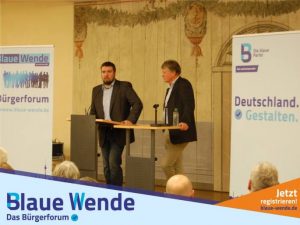 Dass das Konzept der ‚Blauen Wende‘ durchaus aufgeht, zeigte nicht nur vielfältig geäußerte Zustimmung aus den Zuhörerreihen zum Ansatz des Forums, sondern auch die über Parteigrenzen hinweg bunt gestreute Zusammensetzung des Publikums. Darunter SPD-Mitglieder, Freie Wähler aber auch ehemalige AfDler und andere mehr.